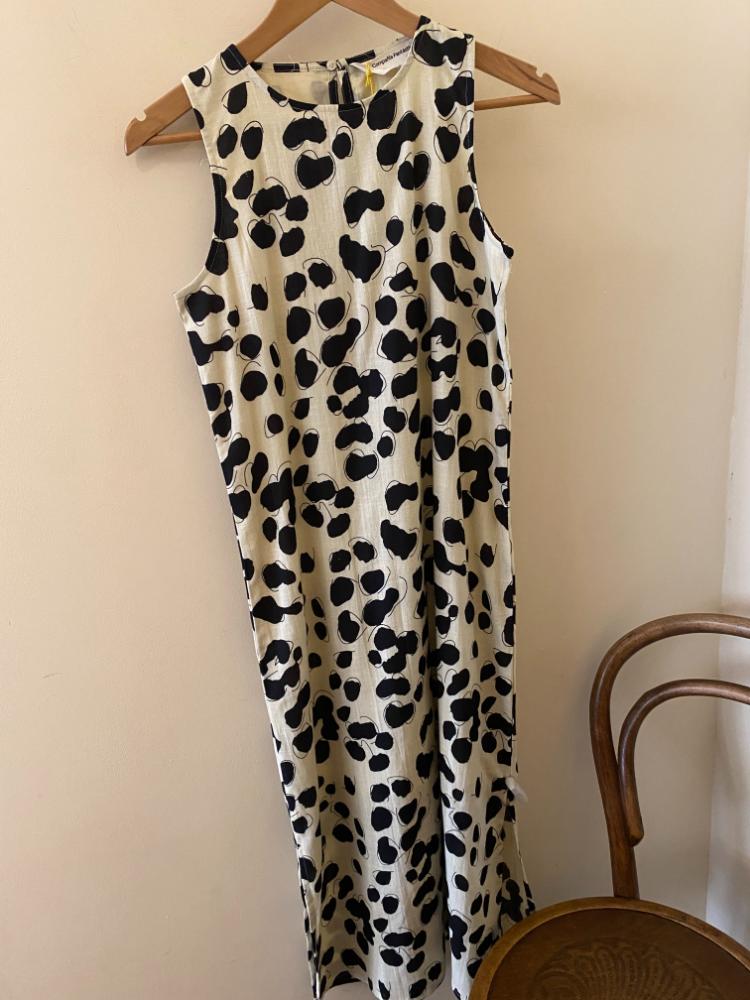 Compania Fantastica Dalmatian Shift Dress. A simple cotton shift dress in a Dalmatian print fabric. This midi length dress is great for warm weather and is a lovely wardrobe addition. Fully lined with small side splits for freedom of movement. Simple button and keyhole fastening at the back of the neck.