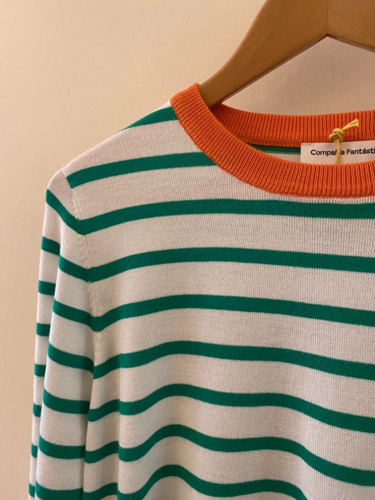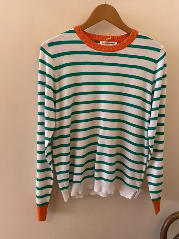 Compania Fantastica Stripe Jumper. A colourful re-imagining of the classic Breton stripe jumper, made in a fresh green and white stripe with contrasting orange collar and cuffs. A silky soft blend of viscose and cotton makes this loose fitting jumper comfortable and easy to wear.