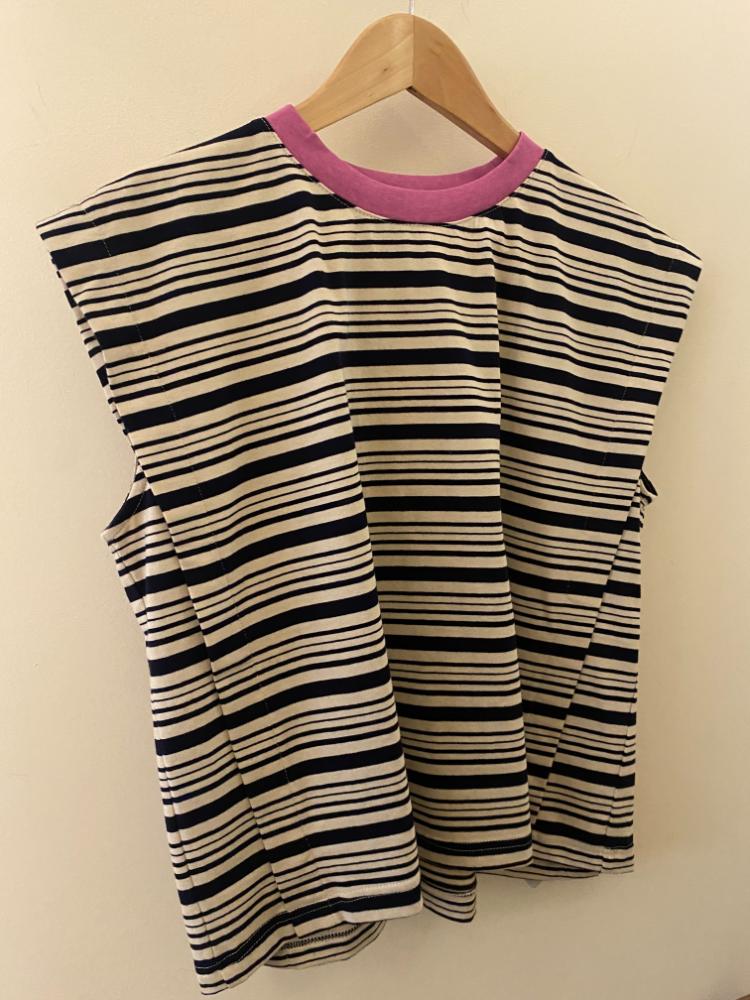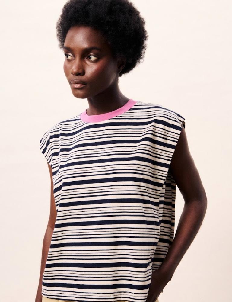 FRNCH ‘Siroka’ Stripe Top. This boxy stripped fabric top from FRNCH is more than just a T-shirt. Featuring a contrasting violet coloured round neck, the ‘Siroka’ also has a layered panel detail to the front. A drop shoulder, sleeveless style that will look great as an elevated but relaxed look.