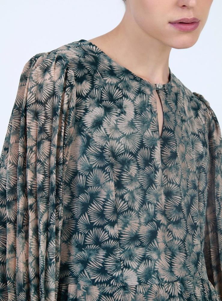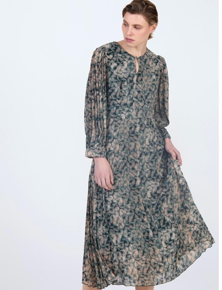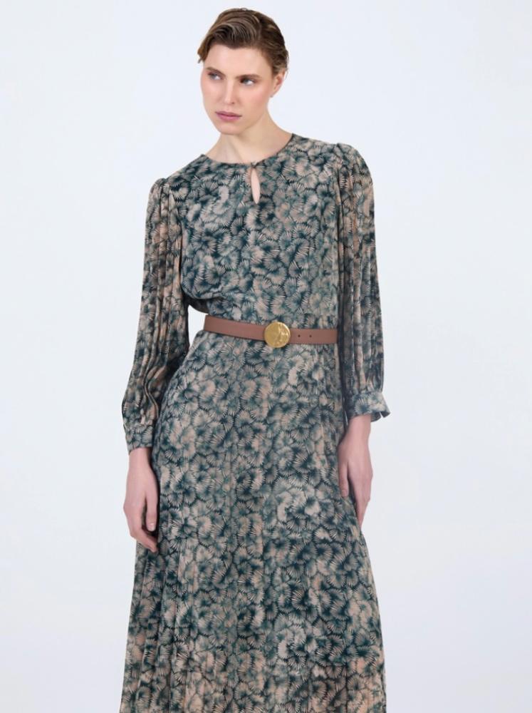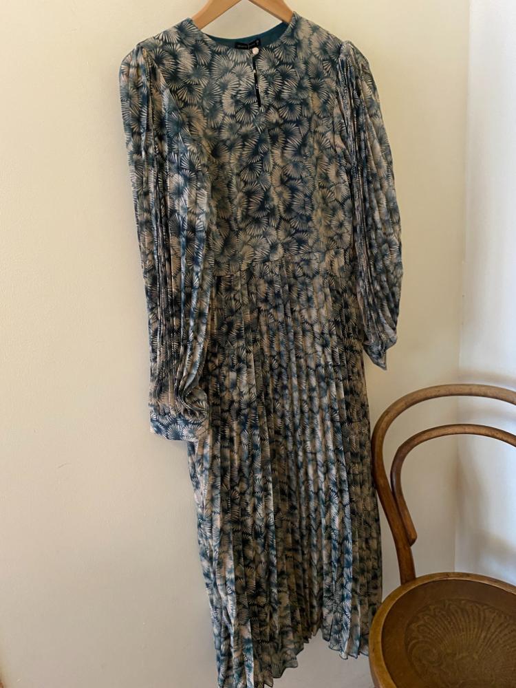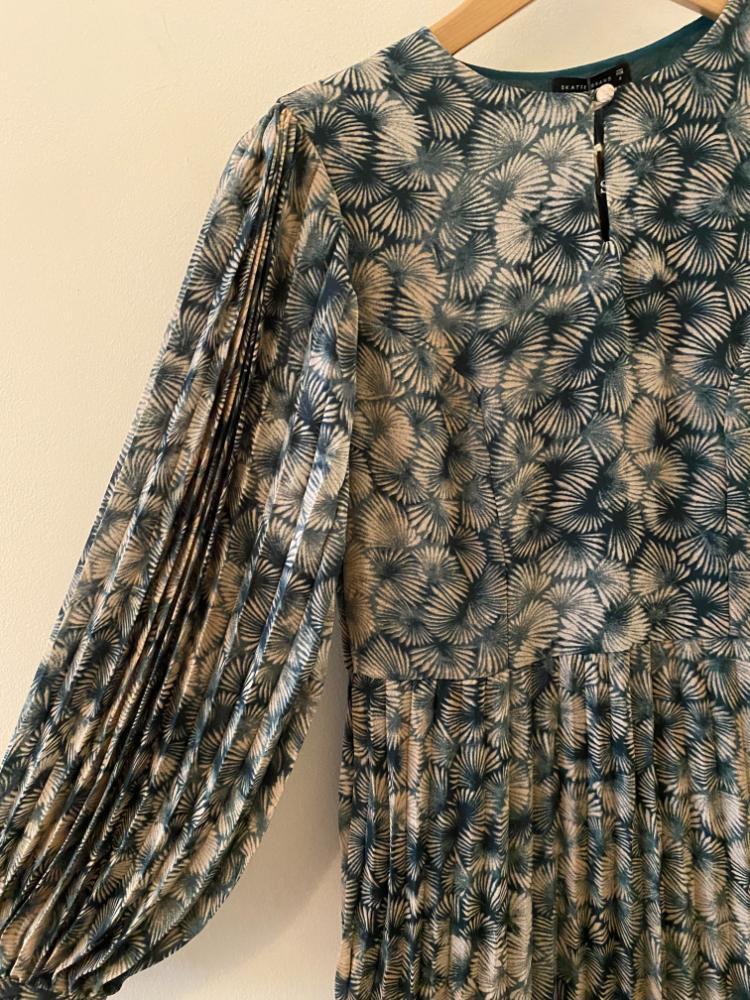Skatie Printed Chiffon Dress. This beautiful deep green and cream printed chiffon dress is perfect for party season. With long pleated sleeves and and a double layered skirt, fully lined in a dark green lightweight fabric. Easy to wear, with an empire waist line and keyhole feature at the front. Side zip fastening.